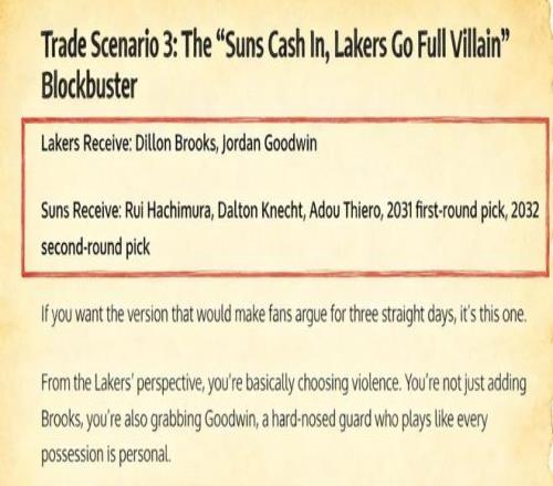 美媒《Fadeaway World》更是直接给湖人提出了一套交易方案,建议他们将克内克特、蒂耶罗、八村垒、2031年的首轮签以及2032年的次轮签送到菲尼克斯,换回狄龙和古德温