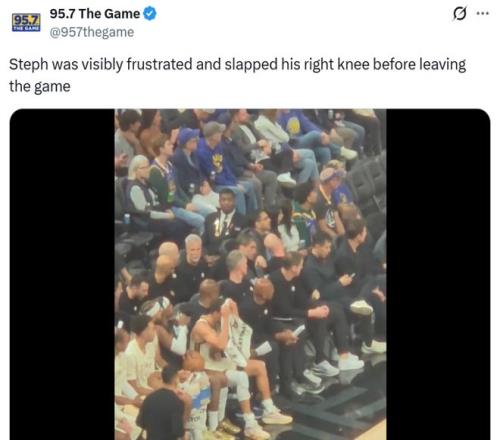 比赛第三节还剩4分多钟时,库里因右膝酸痛提前退出比赛,并缺席末节争夺,赛后湾区媒体95.7 The Game晒出库里在场边的画面。